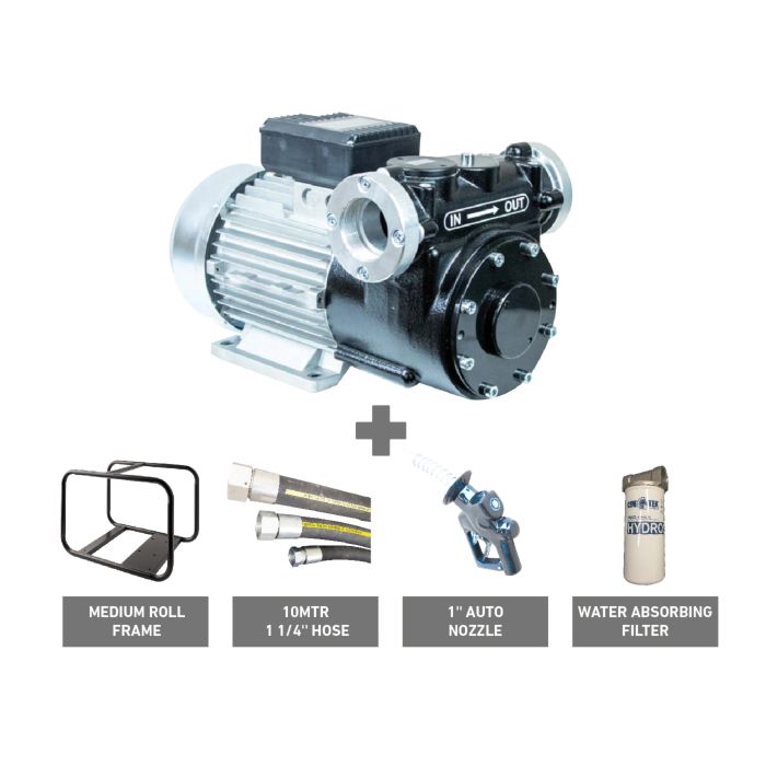 Self priming diesel pump kit , powered by 240 Volt motor. 10Mtr x 1 1/4'' hose, 1'' auto nozzle and water absorbing filter. 110LPM.