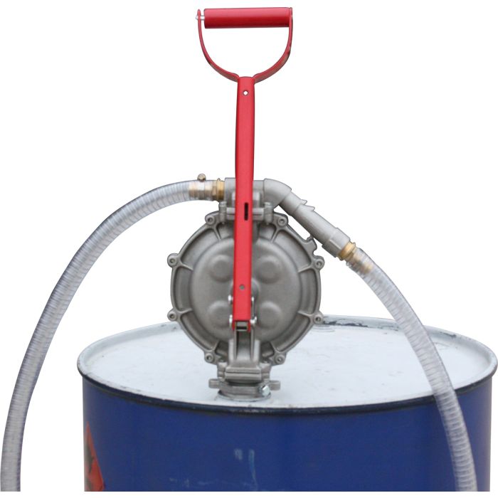 Diaphragm hand pump with 2mt PVC discharge hose and steel telescopic suction pipes for 205lt drums or tank for use as a sampling pump for storage tanks.