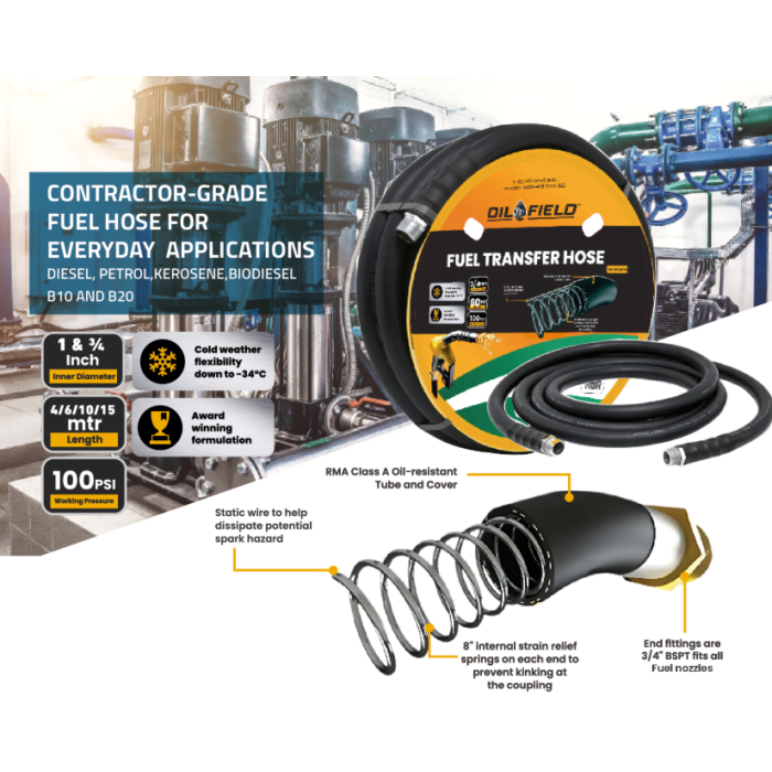 OFD206A Oilfield premium fuel transfer hose antistatic, 20 mm x 6 mtr assembly with crimped ends and internal spring at each end. to prevent kinking, 100 PSI W.P for the serious contractor. Suitable for use with Diesel, Petrol,Kerosene,Biodiesel B10 and B20.
